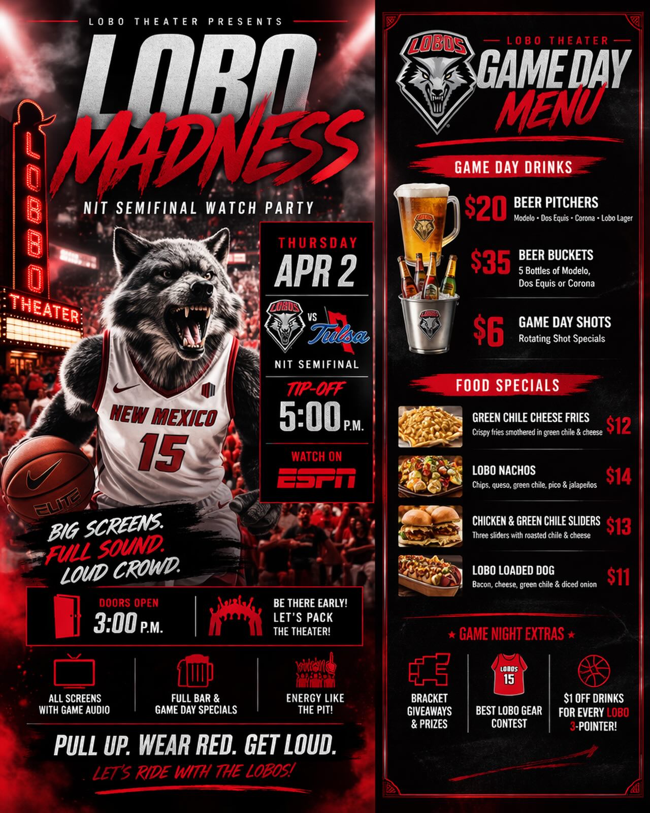 The best UNM Lobos watch party Albuquerque has seen is happening at The Historic Lobo Theater & Event Center — and it's completely free. This UNM Lobos watch party Albuquerque event runs on April 2, 2026 as the UNM Lobos take on Tulsa in the NIT semifinal on every screen in the house, including the...